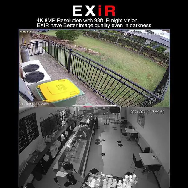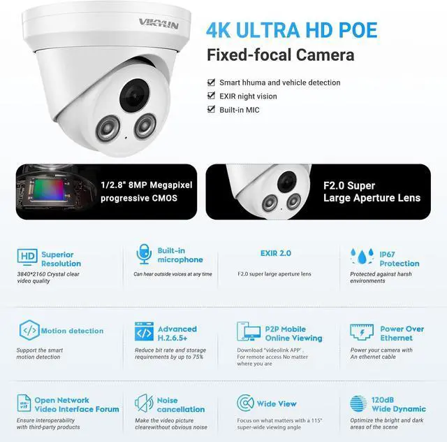 UltraHD 4K 8MP Resolution3840x2160 8-Megapixel @20fps,6MP@30fps resolution featuring enhanced low illumination utilizing the latest CMOS1/2.5" image cmos sensor, 98ft IR night vision,EXIR have Better image quality in darkness. 2.8mm fixed lens provide 103° viewing angle,the 4k poe ip camera can capture more available light, and display more clear image details,always keep your safty