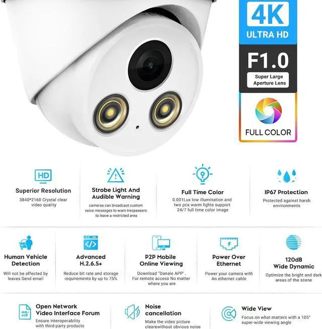 TRUE 4K F1.0 FULL COLOR NIGHT VISIONWith Full color technology, high-performance sensor, large aperture lens and soft supplemental lighting come together enables this Security 4K POE Camera capture full color footages in complete darkness.UltraHD 8MP resolution (3840x2160@20fps)featuring the latest CMOS1/2.8" image sensor, 2.8mm lens wide viewing angle of 115°, the rich-color night vision footages provide you with critical evidences like the color of clothes or a car, even in total darkness
