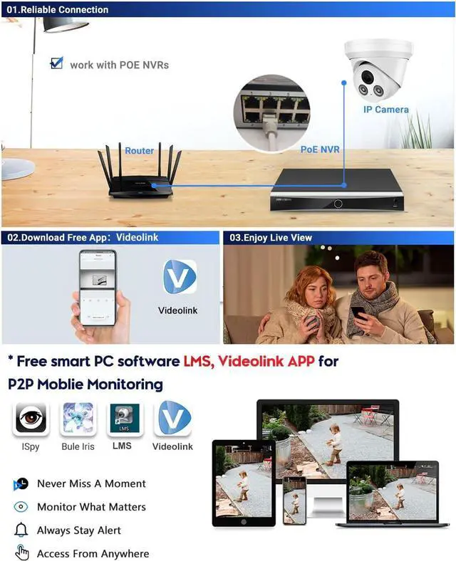 Multiple Working Solutions Easy plug and play with 3rd Party NVRs & Works with Third software, ISpy, Milestone, Etc. Work with 3rd Party NVRs. You can choose VIKYLIN 4K PoE NVR( Please Search ASIN:B0DKXFQYQJ) ; Works on ISpy, Milestone, software. Works with NAS, QNAS. Easy view on Web browser like IE, Firefox, Google Chrome.