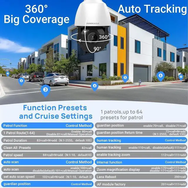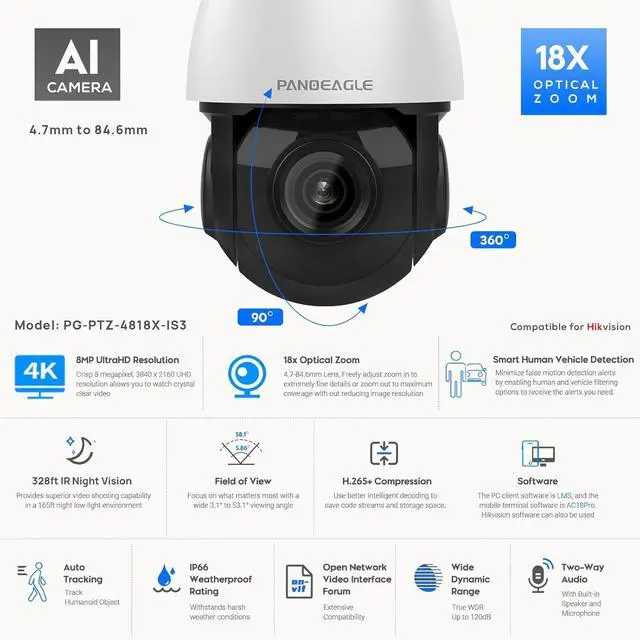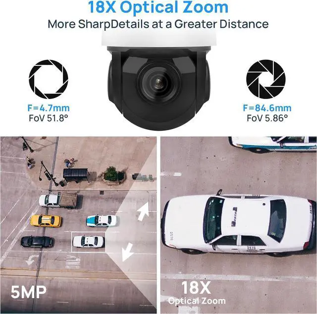 This outdoor ptz camera pan range: 0° to 360°, tilt range: 0° to 90°, powerful 18x optical zoom 4.7 mm-84.6 mm lens, easy to zoom And zoomed out to view distant objects without affecting the image quality, built-in 1/2.8 Scan CMOS, 5MP (2592x1944) @30fps resolution is 3 times that of 1080p cameras. (User Manual attached in the bottom of the product's information. Please download in your needs.)