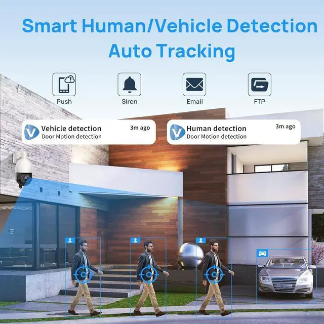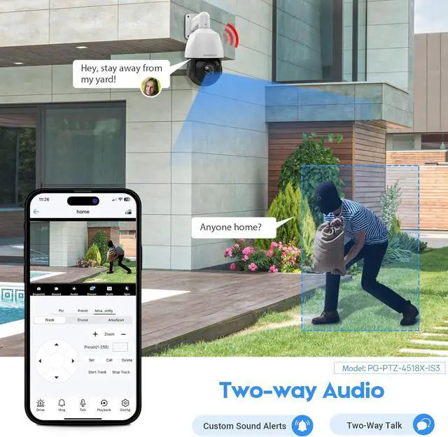 Two Way Talk & Sound AlertOnce the camera detects an abnormal situation, the two-way talk allows you to issue a warning to suspicious persons, when you don't find it in time, the ptz camera can also trigger a sound alarm to scare off intruders, and you can customize a one sound broadcast. Instant push notifications and email alerts allow you to block uninvited people instantly.