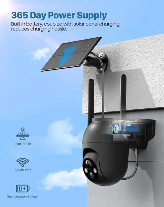 Eliminate Tedious Charging StepsThe solar camera is equipped with a solar panel and a powerful lithium battery, which allows it to be charged by solar energy during the day and powered by the battery at night, never worrying about low battery. Let you completely avoid the trouble of climbing a ladder to remove the outdoor camera for charging.