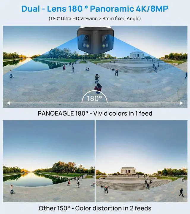 Full-Color Vivid Night VisionThe 180° panoramic outdoor security camera has full-color night vision no matter in day or night, the vivid live view can help you know every single thing. 3 lighting modes for you: color night vision (up to 66ft) and IR fill light B&W night vision (up to 100ft) and smart dual light night vision,you can go to browser settings to change it.