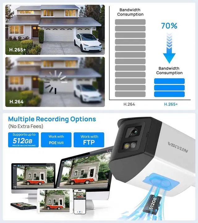Multiple Storage Options The 180 degree security camera Inserting an up to 512GB SD card(not included) into the camera with the automatic cycle recording. Plus, no monthly cloud storage fees, NAS and NVR are supported, LMS software for local storage are supported ,work with Blue Iris, iSpy,these are good data backup ways.