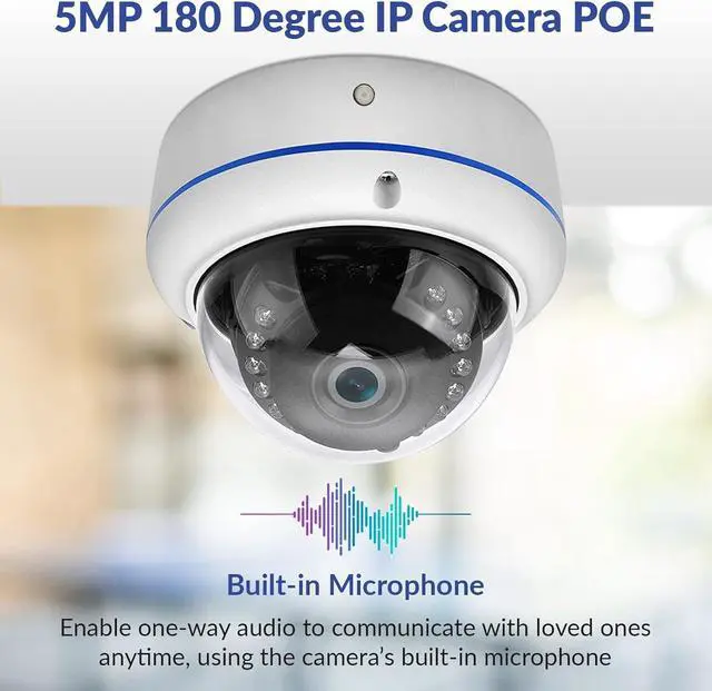 CMOS ILLUMINATION & MIC Stunning low-light 5MP performance with CMOS 1/2.7 image sensor and 5MP resolution (2880*1624). Super-wide 180° viewing angle allows you to cover more ground. Power Over Ethernet (POE camera) for easy installation (POE Injector or Switch Required; Not Included). This is a FIXED IP camera and Does Not Pan/Tilt. Built-in mic for one-way audio.