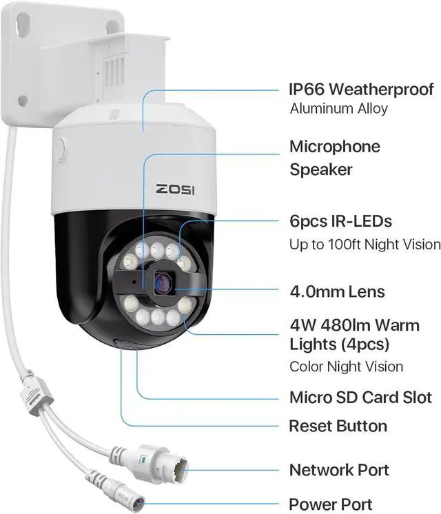 (2). [ 5MP HD & Starlight Color Night Vision ] __ This PT camera is built to endure harsh weather conditions with an IP66 weatherproof rating and high-quality materials, ensuring a longer lifespan and minimal maintenance. Enjoy HD images and full-color night vision thanks to this camera's spotlights & 3K resolution of 2880x1620 pixels, which is nearly 2.5X better than 1080p. Additionally, its high-sensitive starlight sensor enables it to capture high-quality images even in low-light conditions.