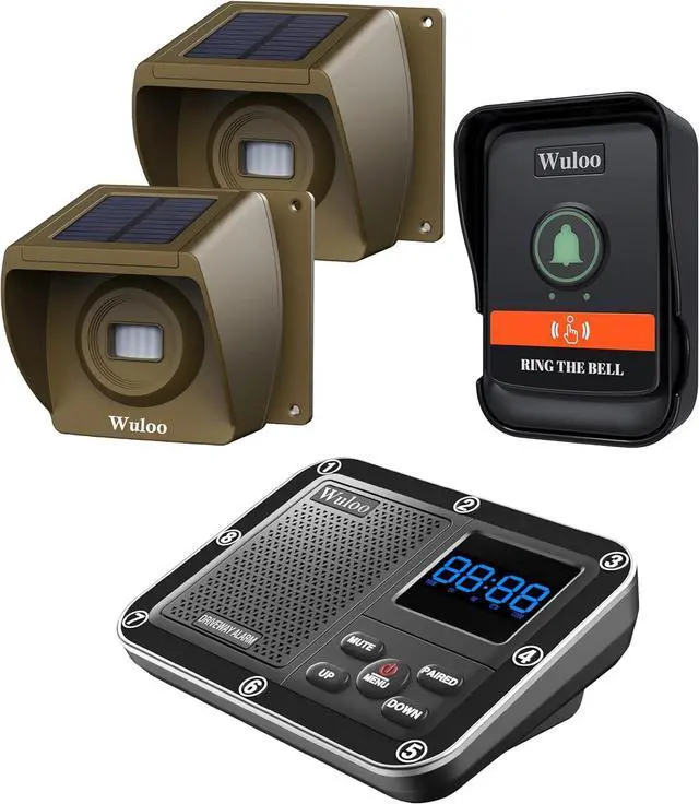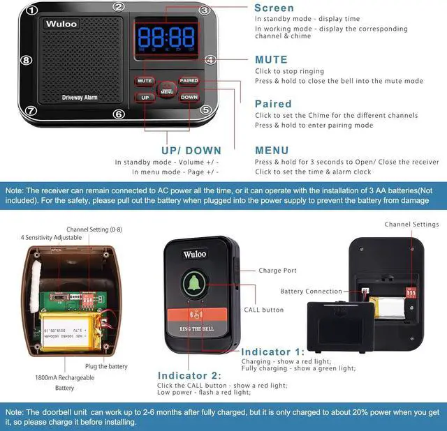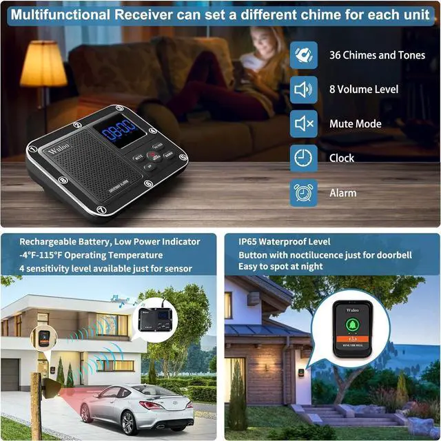 [ Enjoy Better Features ] Many common issues in other similar items have been optimized well in the doorbell chime and driveway sensor by our professional factory, includes the solar panel, adjustable sensitivity, ON/ Off button, low power indicator, rechargeable battery. The receiver also works as a clock and alarm with completely adjustable chimes! Customize your chimes, sounds, volumes, and more! NO Wifi, NO APP.
