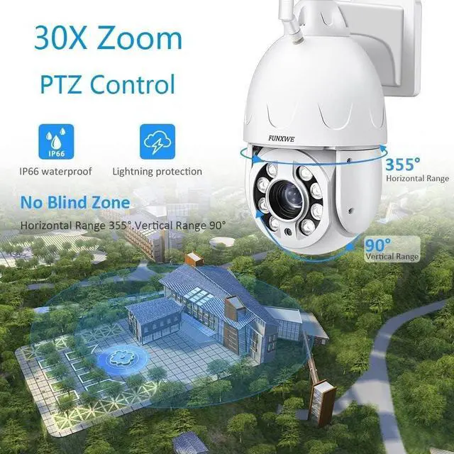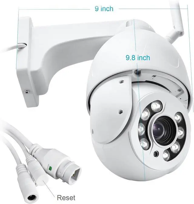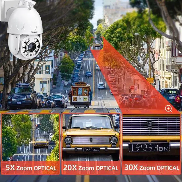 5.0 Megapixels, 30X optical zoom with auto-focus, 2560x1920 resolution, zoom in/out to see clearer details. PTZ rotation: horizontal pan 355°, vertical tilt 90°. Support Onvif, work with NVR, Blue Iris, support RTSP, DDNS settings. Support 2.4GHz, 5GHz dual band WiFi, and Bluetooth connection.