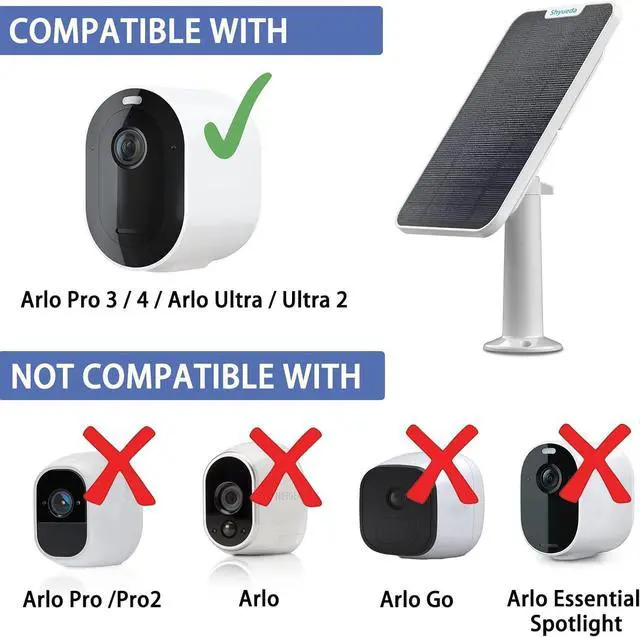 1. CHARGE YOUR DEVICES : solar panel Compatible with Arlo Ultra/Ultra 2 & Arlo Pro 3/Pro 4/Pro 5S ONLY, the solar panel will charge for your camera under big sunlight .Don't need battery and power adapter.(Note:Not Compatible with Aro/Arlo Pro/Pro 2/Arlo Go/Arlo Essential Spotlight).