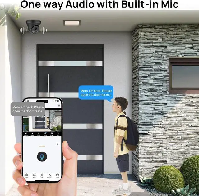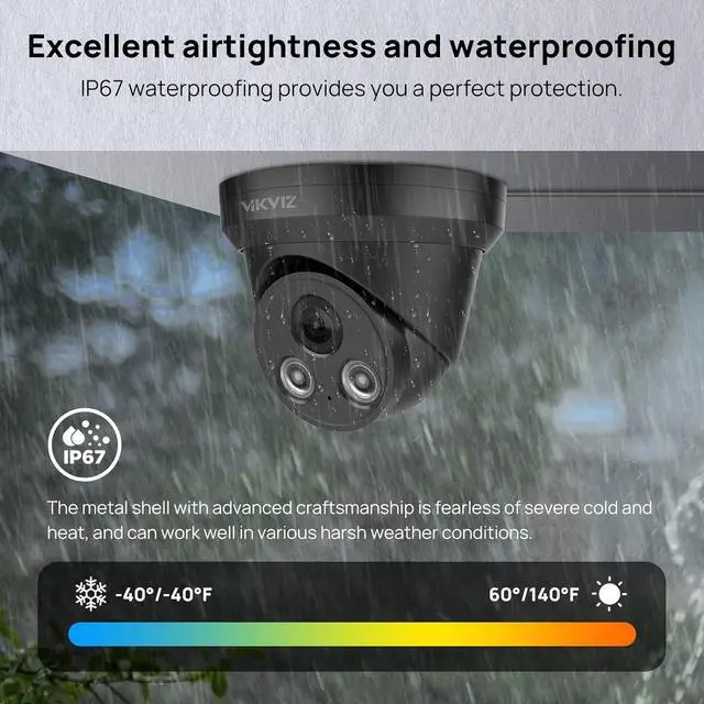 Built-in mic and Efficient CodingThe 5MP IP camera has a built-in microphone that can record the surrounding environment and not miss any details. At the same time, you can also watch vivid videos instead of silent content. Supporting H.265+ and H.265 dual encoding technology, it can save storage space without compromising image quality. The POE camera outdoor is IP67 waterproof and can withstand various outdoor natural environments. It is suitable for installation indoors and outdoors at home.