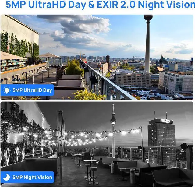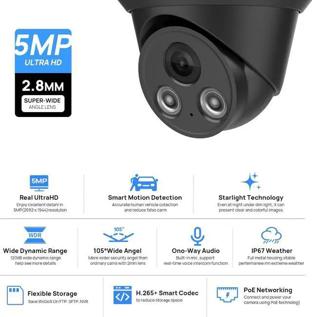 5MP HD Resolution Camera with AI detectionThe 5MP poe camera featuring advanced smart AI human/vehicle detection helps identify real threats accuracy rate up to 98%.The ip camera can optionally record 24/7 or motion triggered video to local storage, NFS and NVR. This 5MP PoE IP camera features Starlight technology, combined with a wide-angle (105° FOV) and an enhanced 98ft IR vision range for enhanced night vision, allowing you to see criminals in greater detail even in the dark.