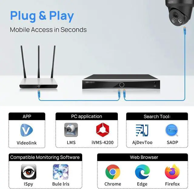 High compatibility poe cameraThis turret poe cameras compatible for most third-party NVRs,support RTSP and On vif protocol to connect with many other brands NVR, work with Blue Iris, iSpy, Web viewer and Mobile APP Videolink,achieving remote view and alarm notification.Choose the VIKVIZ IP Camera for reliable,high-quality surveillance that adapts to your security needs.