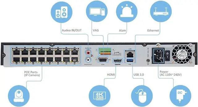 Plug & Play with up to 16 independent PoE network interfaces16-ch network cameras can be connected with 160M incoming bandwidth Up to 2 SATA interfaces