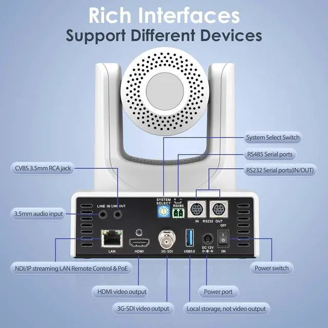 Rich InterfacesADKIDO PTZ camera supports simultaneous output of 3G-SDI, HDMI and USB 3.0 and , compatible with PoE (802.3af) and other network providers, high-tech components ensure low latency, smooth and clear connection to vMix, OBS, Zoom, Skype and other software full HD video. The best choice for live streaming and church events