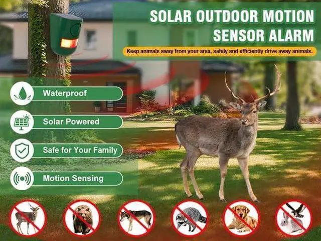 Solve 99% of Animal Invasion Worries:This motion sensor alarm outdoor detects movement within a 125-degree arc and up to 26 feet, emitting 129dB loud sound noise maker and strobe LED light to scare away animals like deer,dogs, bear,raccoons and coyote from your yard or garden