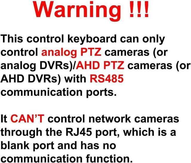Warning: This control keyboard can only control analog PTZ cameras (or analog DVRs)/AHD PTZ cameras (or AHD DVRs) with RS485 communication ports. It cannot control network cameras through the RJ45 port, which is a blank port and has no communication function.
