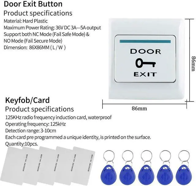 4)A complete access control system kit, including access controller+ Electric Strike Lock +power supply +door exit button+10 RFID key fobs.