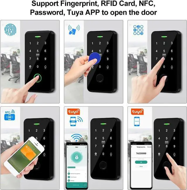 Support 100 user capacity. Support Tuya APP, Mobile phone NFC, Fingerprint, RFID Card, Password to open the door. Working with 13.56MHz frequency.