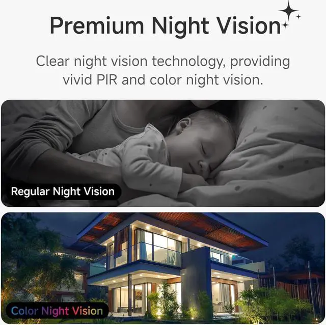 B200 with 1080P HD & Full-Color Night Vision - The home security cameras provide a 1080P HD live stream. 2MP pixels allow you to observe vivid moments of your baby and pets on the Noorio app. Spotlight color night vision technology provides excellent color night vision effects up to 30ft even at night. Noorio outdoor camera wireless keeps being motion-activated 24/7 with a built-in rechargeable battery for 3-6 months