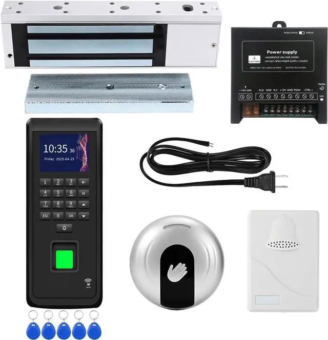All-in-One Access Kit - Complete system includes access control keypad, power supply control, 1200lb electromagnetic lock, no-touch infrared exit button, wired doorbell, and power cord for easy setup.