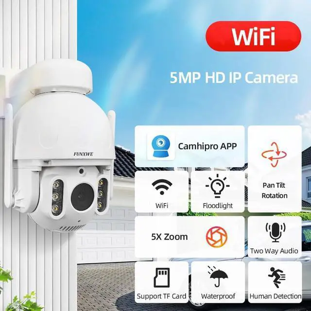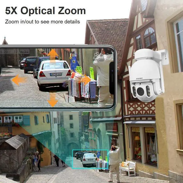 5.0 Megapixels, 5X optical zoom with auto-focus, 2560x1920 resolution, zoom in/out to see clearer details. PTZ rotation: horizontal pan 350°, vertical tilt 120°. Support Onvif, work with NVR, Blue Iris, support RTSP, DDNS settings. Support 2.4GHz, 5GHz dual band WiFi, and Bluetooth connection.