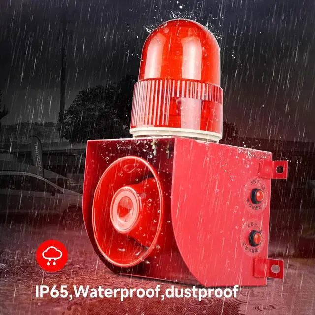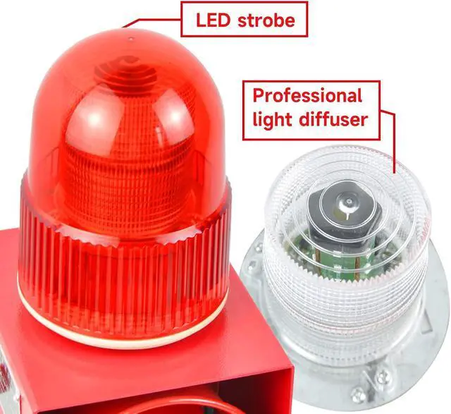 Alarm siren with strobe lightOnce activated there will be red flashing warning light at the same time with the tone, obvious and easy to attract attention; bright LED beads with low power consumption and long service life. Also it is designed with diffuser, can spread the light in a scientific manner