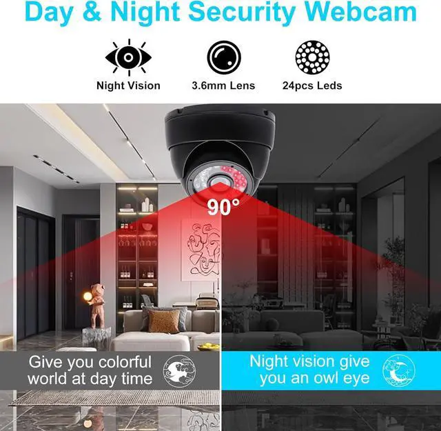 Day&Night Vision with 24 Pcs IR LEDs-2MP webcam with 1/2.7 CMOS 1080p Dome Surveillance CCTV Camera,equipped with 24pcs IR LEDs, night vision (Color in day time,black & white in night time),3.6mm lens that wide enough to cover about 90°view. (Depended on the using environment).