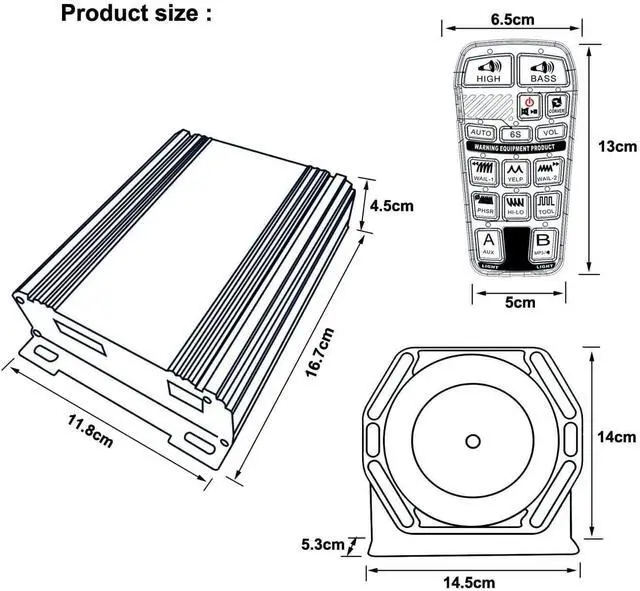 6. ONE FULL SET MATCH-1 Heavy Duty Main Siren Box+1 Ultra Thin Flat Speaker+1 Handheld Remote Controller with Microphone/PA system+1 set of plug-to-work(PTW) wiring harnesses+User's Guide.