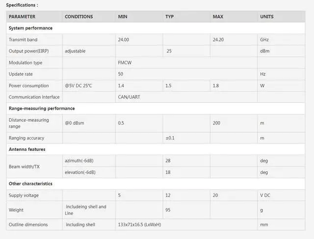 Features Work in 24GHz Band for the detection of moving targets Adaptable for grasslands and other environment With UART interface With measurement accuracy of 0.1m With the measurement range of 200m RoHS compliant