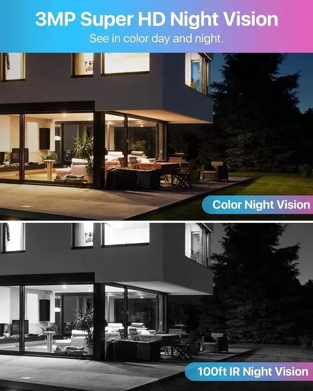 3MP Dual Night Vision & All-Weather Metal Housing-- Crisp 3MP resolution captures sharp details day and night, with dual-mode vision: Full-color footage (powered by built-in warm light) or infrared B&W for total darkness. Encased in rust-proof IP66 aluminum housing, this camera withstands rain, snow, and extreme temperaturesideal for outdoor/indoor security. Easy wall/ceiling mount ensures flexible installation.