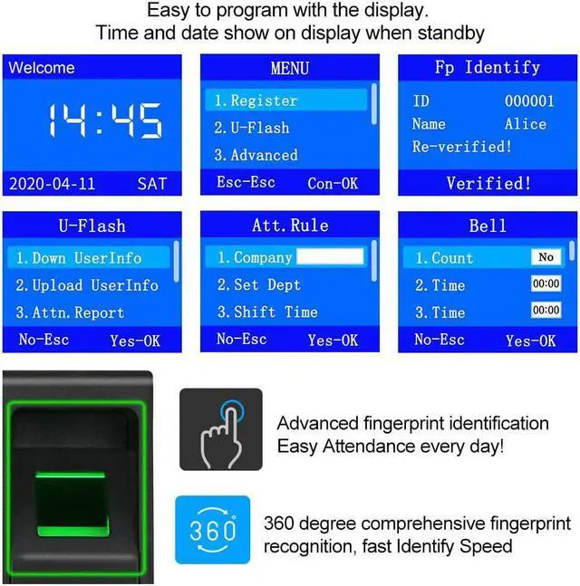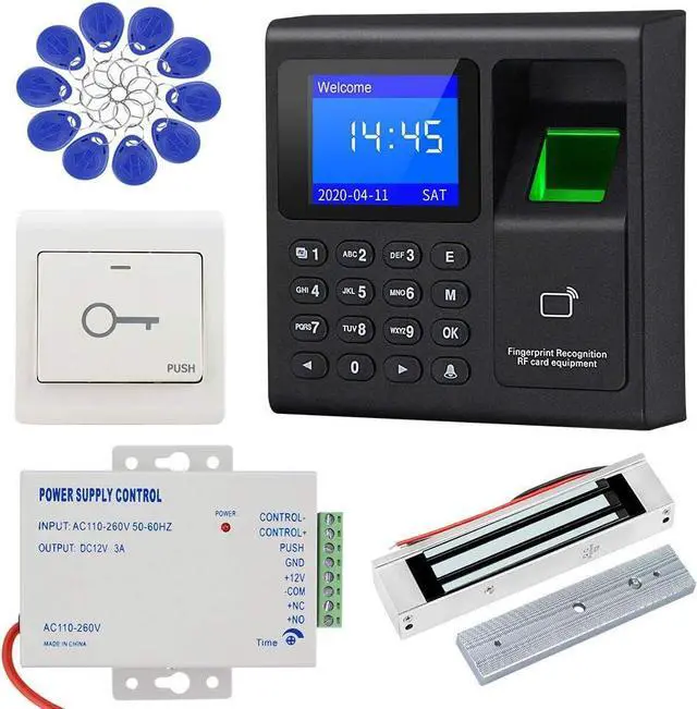 1, Introduction: This is a complete access control system, contain a fingerprint access controller, a power supply, a magnetic door lock, a switch button, and 10 pieces 125KHz RFID keychains. Off-line working, support to download attendance reports with U disk.