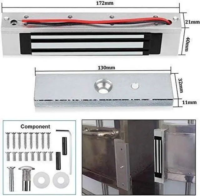 3, Electric Magnetic Lock: 180kg/350lbs holding force. NC mode: Locked when power on, unlocked when power off. Suitable for wooden door, metal door, glass door, PVC door, security door, etc.