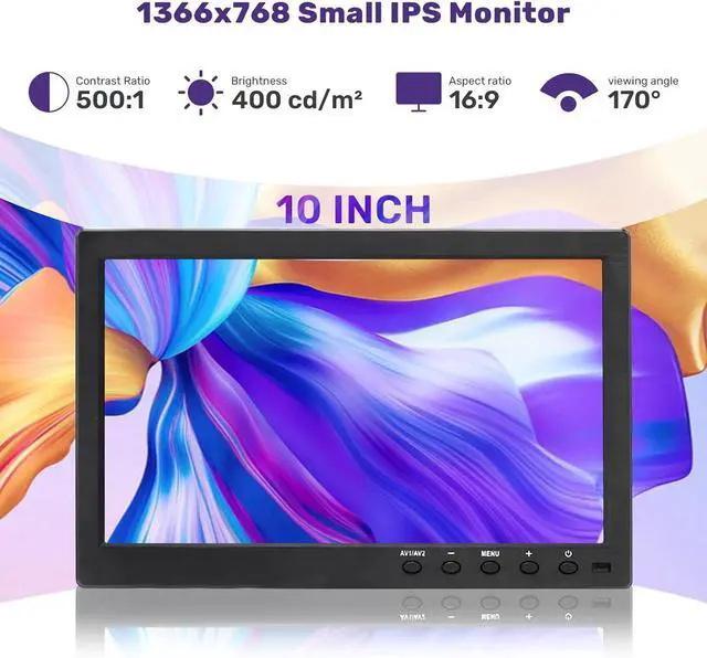 10.1" Small IPS MonitorOSCY 10.1 inch TFT LED security monitor with HD 1366x768 resolution, 500:1 contrast ratio, 400 cd/m2 brightness,16:9 aspect ratio and wide viewing angle, bright saturated images and high colour reproduction will bring you a pleasant visual enjoyment.