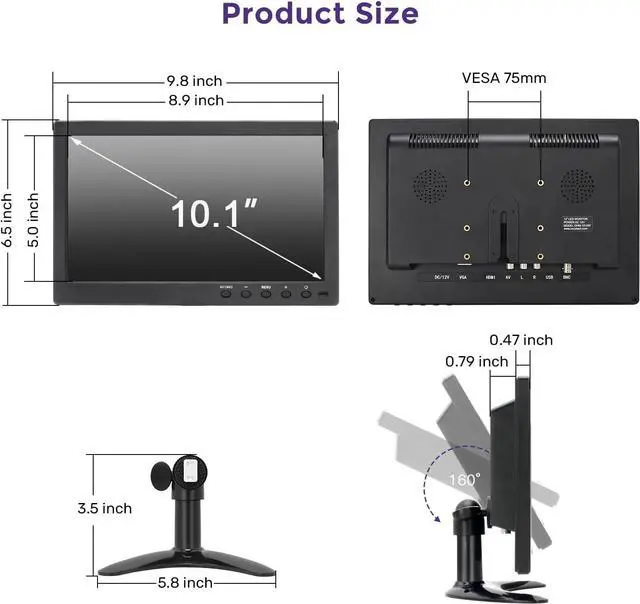 Two-way Mounting & 170° Wide Angle ViewingThis 10.1 inch hdmi monitor can be easily mounted on a wall with the industry standard VESA 75mm bracket (not included) or on a desktop with supplied the adjustable bracket. The 170° horizontal and vertical viewing angles provide a clear view of the screen from a variety of angles.