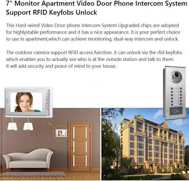 Easy to install,wired connection stability for home security.Can be used in apartments,villas,hotels,offices,public buildings.Support video intercom Max 12 monitors. (Note: if you need RVV-4 Wire for the indoor unit and outdoor unit connection, please search: "B07PJRHPQ2".)