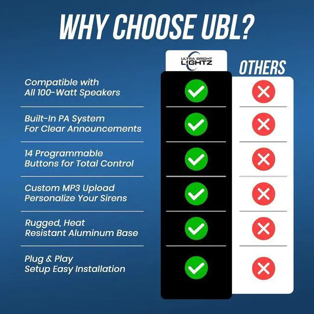 Custom MP3 Tone Uploads via USB: Add up to 30 of your own MP3 siren tones for a fully personalized setup. Simply connect this handheld siren and light controller to a computer using the built-in USB port to upload new tones. Includes 6 preloaded standard siren sounds like Wail, Yelp, and Hi-Lo