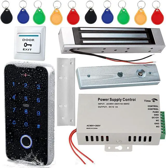 5. Package including: Metal shell fingerprint RFID keypad controller + DC 12V power supply + 180kg(380lbs) magnetic lock and L bracket + door release switch + 10pcs smart key fobs.