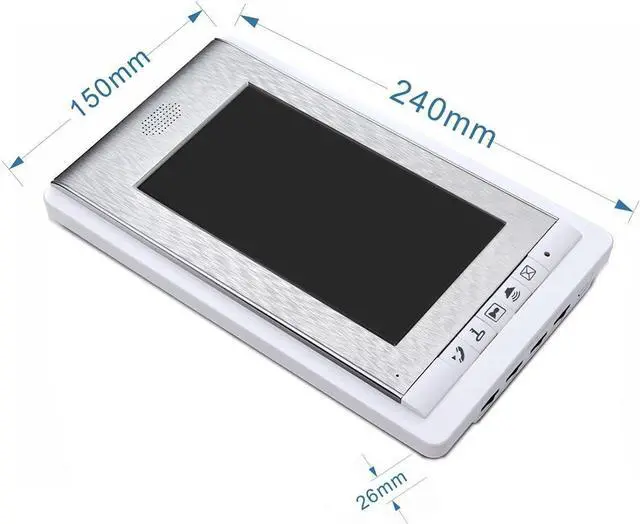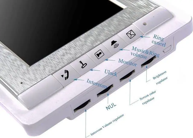 7 MAIN FEATURES --- 7 Inch LCD touch screen;16 different kinds of door bells chimes; Volume, brightness and contrast are adjustable; IR camera with night vision;Electric lock-control function;Handfree intercom;Auto turn off.