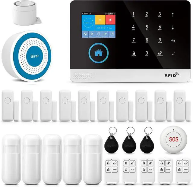 [ Package Includes ]: 1* alarm host; 1* on-site alarm siren; 1* PE-513 siren; 5* PIR motion detector; 10* door/window sensor; 3* RFID card; 5* remote control,1*SOS button.