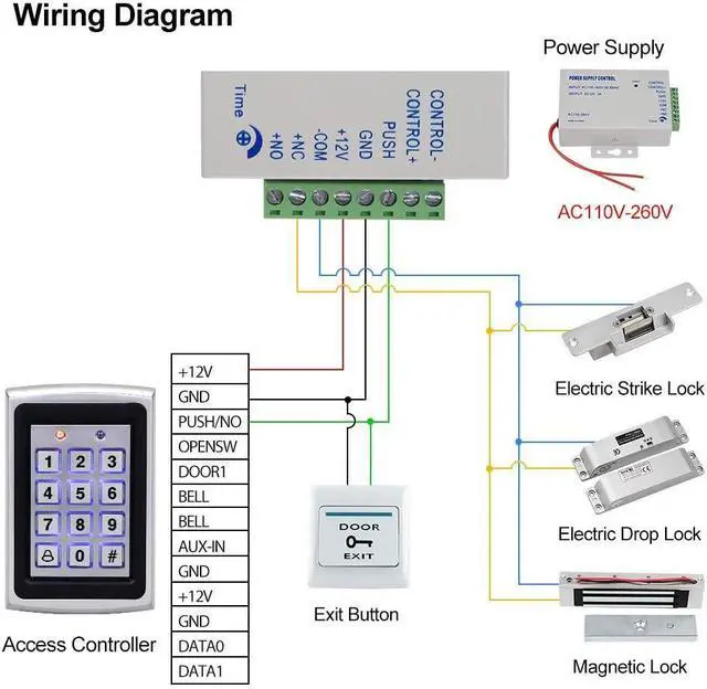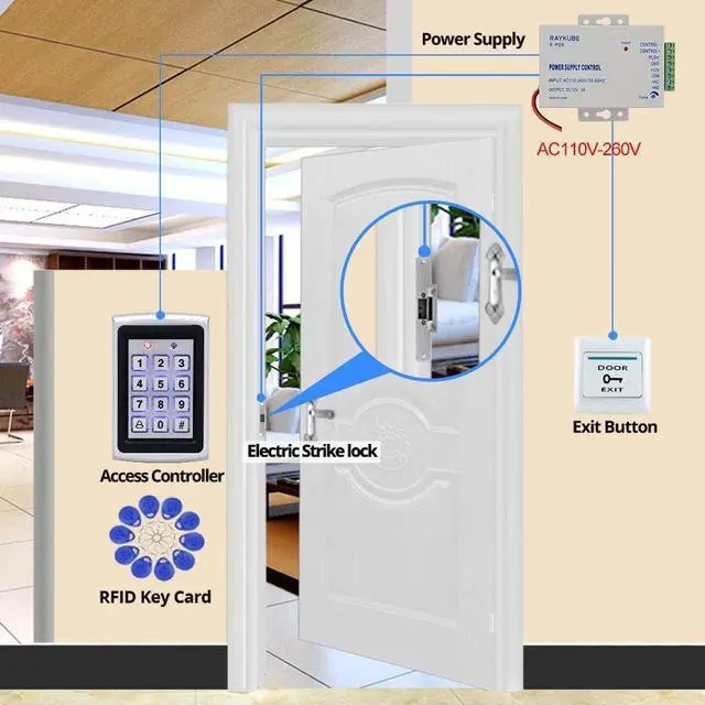 5) Package including access control keypad + Electric strike lock + power supply+ door exit button +10pcs Keyfobs.