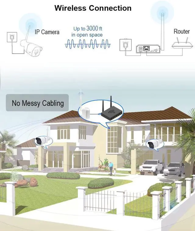 Point to Point Connection for Wireless ExtensionThis wireless bridge camera set support point-to-point, point-to-multipoint modes to extend camera monitoring range. Such as lane monitoring, elevator monitoring,extedng the network in the house to your backyard, garden,barn,street,etc. Wireless bridge point-to-point, supports up to 8 cameras. No need to insall a new modem.