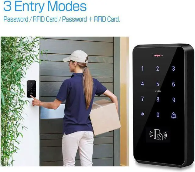 5. Package including: waterproof RFID keypad, 180kg/380lbs magnetic lock, professional power supply, door release switch, 10pcs RFID key fobs.