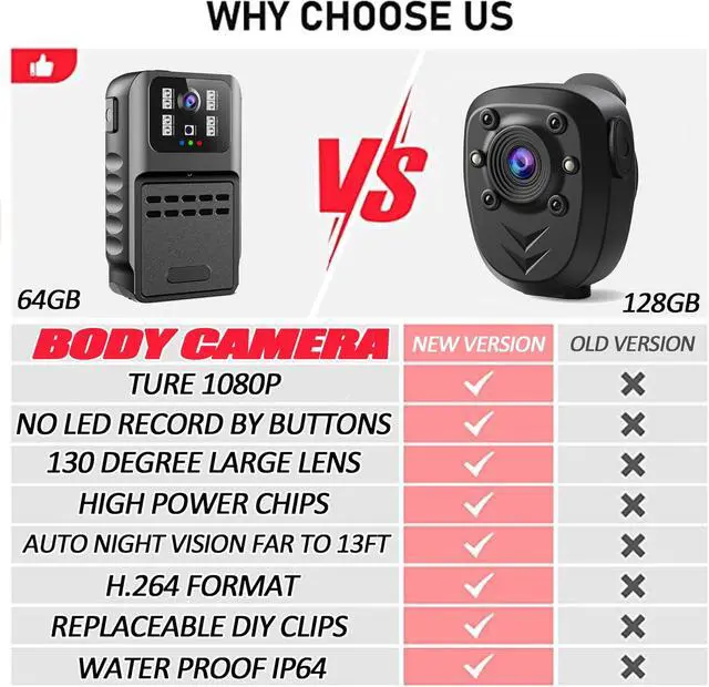 Built-in 64GB Memory + Waterproof IP6464GB card can save nearly 11 hours of videos when recording. KSAD Body Camera Built-in 64GB high-speed reading storage SD card for all your video, picture, and 1080P recordings. There will be plenty of space to store all videos captured throughout your upcoming working days. Camera with Bereplacedable SD card - max support 128GB SD card. / With the IP64 Waterproof, it's easy to keep recording on a little rainy day [unsupport record in heavy rain ]