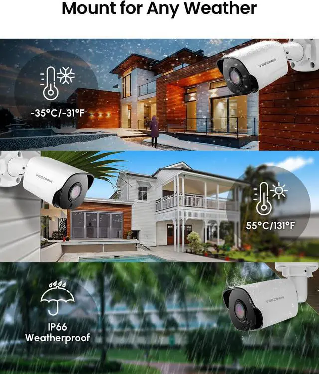 Ip66 Outdoor Security Camera Weatherproof Ip66 And Working Temperature Ranging From -35°C To 55°C (-31°F - 131°F) Enables Veezoom Poe Bullet Camera Work Properly Outdoor Or Indoor. The Ethernet Camera Transmit Both Data And Power Via A Single Network Cable, Extending Up To 330Ft Via Cat6 Or Cat7 Cable.