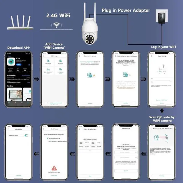 EASY TO CONNECT & SET UP, USER-FRIENDLY APP SECURITY CAMERA: Set-up by using Phone APP (iCSee). You can remote access and operate this smart security camera via Phone. Easy to share surveillance cameras accessing rights with family members. Multi-user can view at the same time. Support 2.4Ghz Wi-Fi(NOT 5Ghz Wi-Fi), and support up to 128G Micro SD card. (Not include SD card in the package)