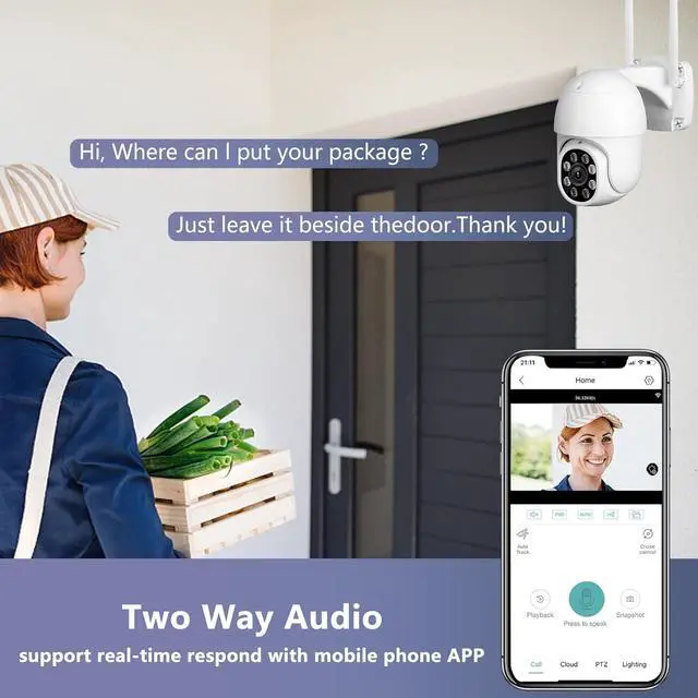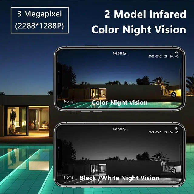 2K/3MP & TWO WAY AUDIO OUTDOOR CAMERA WiFi: Full HD 3MP(2288x1288P) video WIFI home security cameras offers stunning clear picture for day and night, built-in anti-noise microphone and speaker, easily allows you to talk with families and visitors on the phone. Tips: NOT batteries power, and it's NOT wire-free. The WiFi camera needs DC adapter power and electrical outlet.