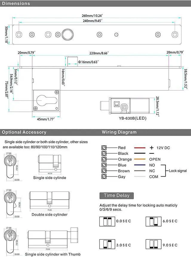 Low Temperature, safe & Durable Low Power, Environmental Protection Superior Strength Aluminium Alloy, Solid Stainless Steel Bolt Door statue signal output contact NC/NO/COM Tips: Default come with single side cylinder with Thumb