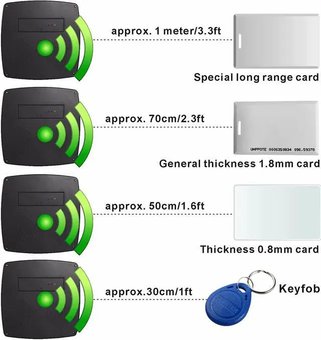 Normally, the unit can also work with normal EM cards,normal 2mm/0.08" thickness card can reach 60cm/23.6" range, 0.8mm/0.03" card can reach 40cm/15.7" range.