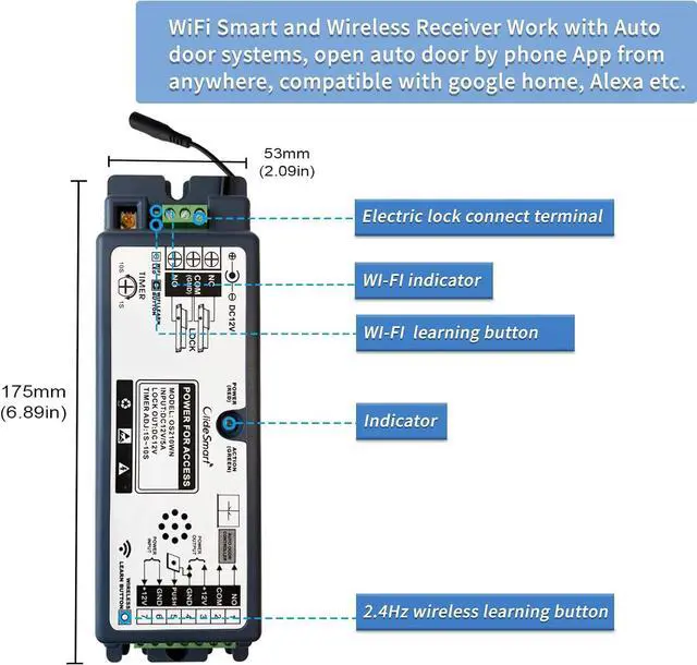 Wireless Function: 2.4Ghz wireless receiver, no need any hard-wired for Handheld remote, Push button, wave to open button, Access Keypad etc.
