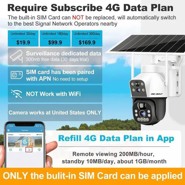 [Preferd GENBOLT 4G SIM Card] LTE sim camera can refill and check 4G data at any time in APP, don't worry about no data. GENBOLT Surveillance dedicated data, high speed, real time, no frame drop. Powerful 4G basebank chip+intelligent algorithm to save data of surveillance camera. GENBOLT 4G SIM card has been paired with APN, no need to setup.300mb free data for 4g wireless camera outdoor, 30 days trial